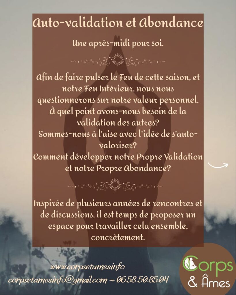 Durant cette après-midi, nous questionnerons notre capacité à nous auto-valider. Puis, une méditation guidée vous proposera de nettoyer votre propre tribunal intérieur. Deux rituels puissants viendront clôturer et ancrer cette nouvelle confiance en vous et votre regard. Inversons les 90/10%. Nous avons besoin des autres, mais dans leur lumière et leurs forces, non pas dans leurs limitations ni leurs peurs.